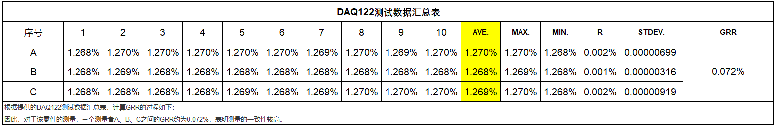 เพื่อให้แน่ใจว่าการ์ดเก็บข้อมูลที่เลือกตรงตามข้อกำหนด ทีมงาน ME จึงทำการทดสอบ การวิเคราะห์แสดงให้เห็นว่าการ์ดเก็บข้อมูลที่เลือกมีเสถียรภาพดีเยี่ยม โดยมี GRR ประมาณ 0.072% ในกลุ่มตัววัดสามตัว A, B และ C