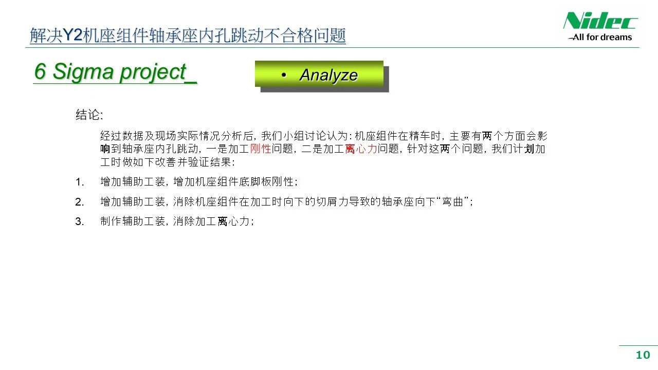 ทีมงานใช้เครื่องมือวิเคราะห์ เช่น PFMEA (โหมดความล้มเหลวของกระบวนการและการวิเคราะห์ผลกระทบ) และแผนภาพก้างปลา เพื่อทำการวิเคราะห์สาเหตุเชิงลึกกับข้อมูลที่รวบรวมและค้นหาสาเหตุที่แท้จริง ซึ่งรวมถึงการระบุการกระจายของข้อมูล แนวโน้มการเปลี่ยนแปลง การระบุค่าผิดปกติ การวิเคราะห์ความสัมพันธ์ระหว่างตัวแปรกระบวนการ และการระบุสาเหตุที่แท้จริงของปัญหาที่อาจเกิดขึ้น ด้วยการสร้างการเชื่อมโยงระหว่างปัญหาและสาเหตุ ทีมงานสามารถสร้างความเข้าใจอย่างลึกซึ้งเกี่ยวกับธรรมชาติของปัญหา และวางรากฐานสำหรับการกำหนดแนวทางแก้ไขที่มีประสิทธิภาพ ตัวอย่างเช่น จากการวิเคราะห์แผนภูมิเรดาร์ของข้อมูลการเบี่ยงเบนหนีศูนย์ของรูด้านในของที่นั่งตลับลูกปืน เราสามารถสรุปได้ว่าสาเหตุของปัญหานี้รวมถึงอิทธิพลของความแข็งแกร่งของการตัดเฉือนและแรงเหวี่ยงของการตัดเฉือนที่มีต่อค่าเบี่ยงเบนมาตรฐาน ตามหลักการของ DOE (การออกแบบการทดลอง) แผนการปรับปรุงได้รับการออกแบบเพื่อตรวจสอบว่าสมมติฐานของสาเหตุนั้นถูกต้องหรือไม่ จากนั้นจึงพบสาเหตุที่แท้จริง