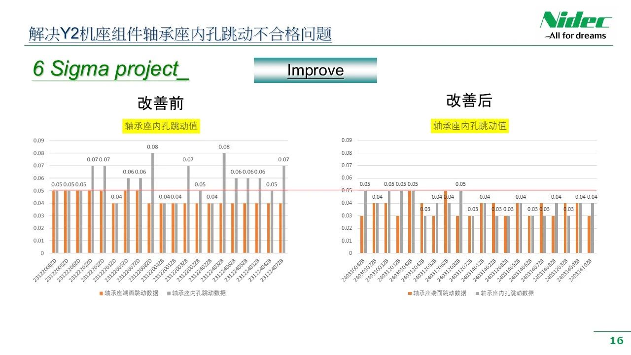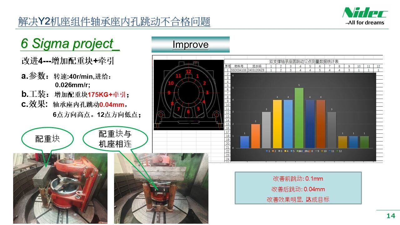 ด้วยการปฏิบัติตามนโยบายคุณภาพและปรัชญาการบริหารจัดการของบริษัทที่ว่า "ตอบสนองตนเอง ตอบสนองลูกค้า ซื่อสัตย์และไว้วางใจได้ และมุ่งมั่นเพื่อความเป็นเลิศ" เราจึงให้บริการลูกค้าด้วยผลิตภัณฑ์ที่มีต้นทุนประสิทธิผลสูงกว่าและมีคุณภาพมีเสถียรภาพมากขึ้นอย่างต่อเนื่อง เมื่อเร็วๆ นี้ ในโรงงานตัดเฉือน มีปรากฏการณ์ที่ขนาดหลักหรือพิกัดความเผื่อทางเรขาคณิตของกระบวนการหลักบางกระบวนการไม่เสถียรหลังการประมวลผล และไม่เป็นไปตามข้อกำหนดการควบคุม 6 - Sigma ฝ่ายบริหารของบริษัทให้ความสำคัญอย่างยิ่งกับสิ่งนี้ และได้ส่งเสริมการประชุมเชิงปฏิบัติการเพื่อจัดตั้งคณะทำงานด้านการปรับปรุงคุณภาพการประชุมเชิงปฏิบัติการ คณะทำงานนี้ประกอบด้วยผู้นำจากแผนกที่เกี่ยวข้อง วิศวกรที่เกี่ยวข้อง ผู้นำทีม และพนักงานฝ่ายผลิตระดับแนวหน้า ด้วยการใช้วิธี DMAIC ของการปรับปรุง 6 - Sigma จึงมีการเปิดตัวแคมเปญการปรับปรุงคุณภาพที่ครอบคลุม กิจกรรมการปรับปรุงต่างๆ เช่น การตรวจสอบประวัติ การรวบรวมข้อมูล การสรุปปัญหา การวิเคราะห์สาเหตุ และการกำหนดมาตรการการปรับปรุงระยะสั้นและระยะยาว ทำให้งานปรับปรุงคุณภาพได้รับการดำเนินการอย่างเต็มที่ กิจกรรมการปรับปรุงนี้ได้เพิ่มความสามารถเชิงปฏิบัติของผู้จัดการและพนักงานระดับรากหญ้าอย่างครอบคลุมในการทำความเข้าใจ ประยุกต์ใช้ และส่งเสริมเครื่องมือการปรับปรุง 6 - Sigma ในลักษณะคู่ขนาน ช่วยลดความแปรผันและความผันผวนของคุณลักษณะด้านคุณภาพของชิ้นส่วนเครื่องจักร ซึ่งจะช่วยปรับปรุงคุณภาพการผลิตโดยรวมของมอเตอร์ และช่วยให้ลูกค้าได้รับผลิตภัณฑ์ที่มีคุณภาพดีขึ้น