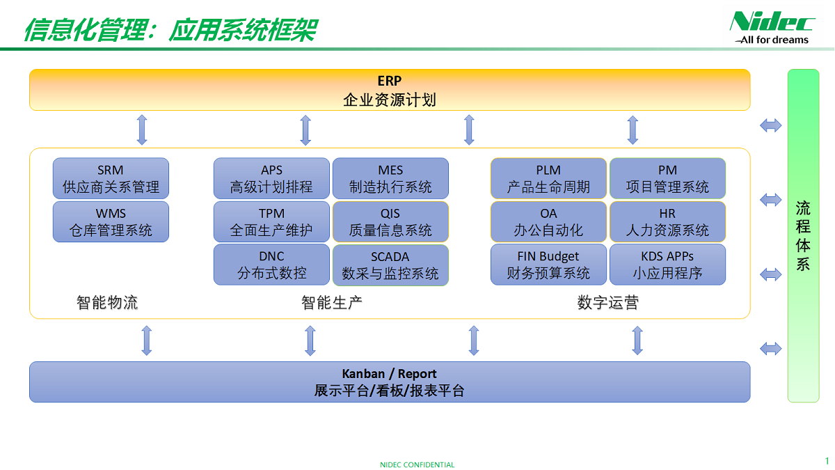 Nidec Lift Motors ได้พัฒนาระบบอย่างอิสระ เช่น SRM (การจัดการความสัมพันธ์กับซัพพลายเออร์), MES (ระบบการดำเนินการด้านการผลิต), APS (การวางแผนและการจัดตารางเวลาขั้นสูง), WMS (ระบบการจัดการคลังสินค้า) และ TPM (การบำรุงรักษาประสิทธิผลทั้งหมด) บริษัทสร้างระบบการผลิตอัจฉริยะทั้งหมดผ่านระบบอัตโนมัติ ดิจิทัล การสร้างแบบจำลอง การสร้างภาพ การบูรณาการ และระบบอัจฉริยะ ช่วยเพิ่มขีดความสามารถให้กับการจัดตารางการผลิตที่สมดุลและการผลิตอัจฉริยะที่ยืดหยุ่น และวางรากฐานที่มั่นคงสำหรับการสร้าง "โรงงานประภาคาร" ในอนาคต
